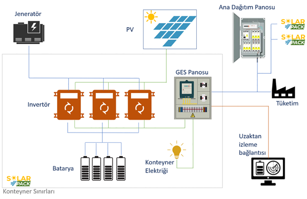 Sistem, hem bir yerden bir yere nakliyatı, hem de sisteme koruyucu kabin işlevini gören bir adet 20 feet konteyner, fotovoltaik güneş panelleri, güneş panellerinin taşıyıcı konstrüksiyon sistemi, DC-AC invertörleri, Lityum-ion batarya sistemi ve kontrol sisteminden oluşmaktadır. Konteynerler, içten ısıl izolasyonludur, aydınlatma ve zayıf akım sistemi ile donatılmıştır. İç mahal sıcaklığını ekipmanlar ve personel için konfor şartlarında tutan, çöl ortamına uygun bir klima sistemi mevcuttur. Sistemde paratoner ve topraklama sistemi mevcuttur ve konteyner içinde montaja hazır gelmektedir. Tip-A konteyner üstüne montajlı, Tip-B araziye montajlı dizayndır. Ürün, her 2 kullanıma da uygun gelmektedir.